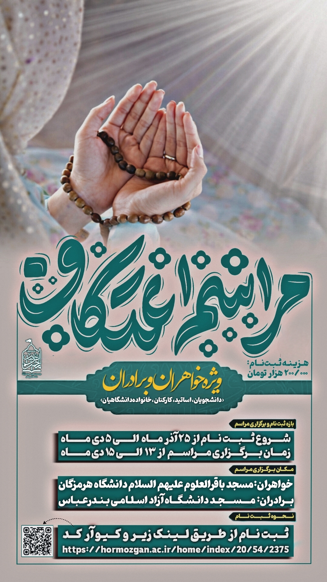 دانشگاهیان محترم دانشگاه هرمزگان میتوانند از تاریخ ۲۵ آذرماه لغایت ۵ دیماه با مراجعه به لینک زیر نسبت به ثبتنام در این مراسم معنوی اقدام نمایند: