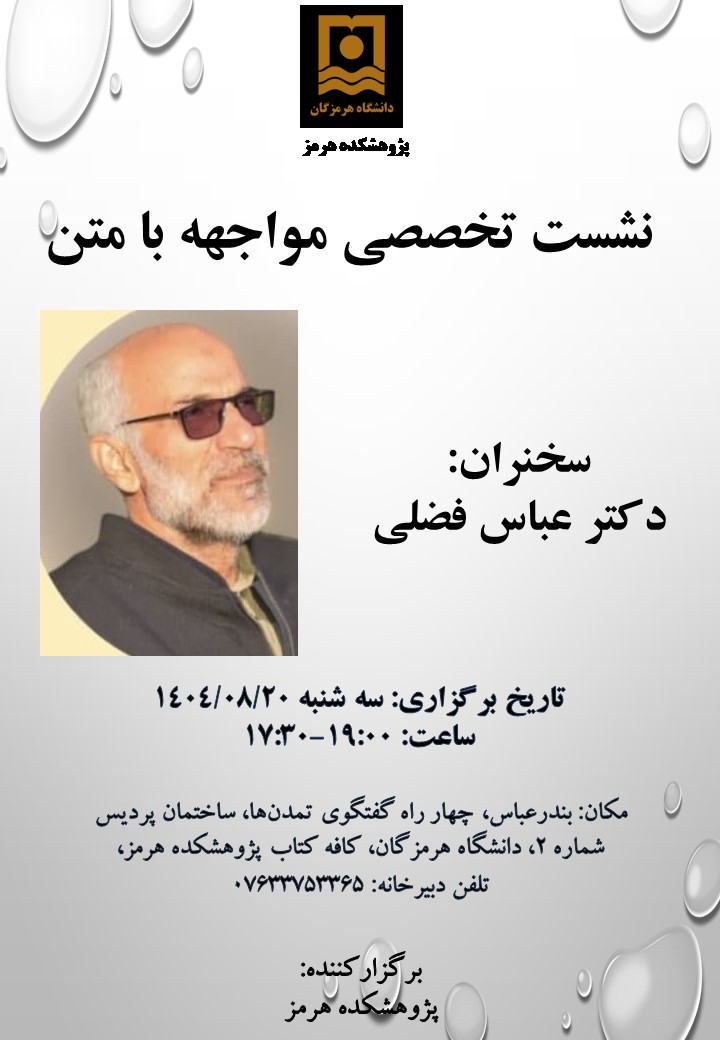 نشست تخصصی مواجهه با متن توسط دکتر عباس فضلی روز سه شنبه مورخ 20 آبان ماه 1404 ساعت 17:30 لغایت 19:00 در کافه کتاب پژوهشکده هرمز دانشگاه هرمزگان برگزار می‌گردد.