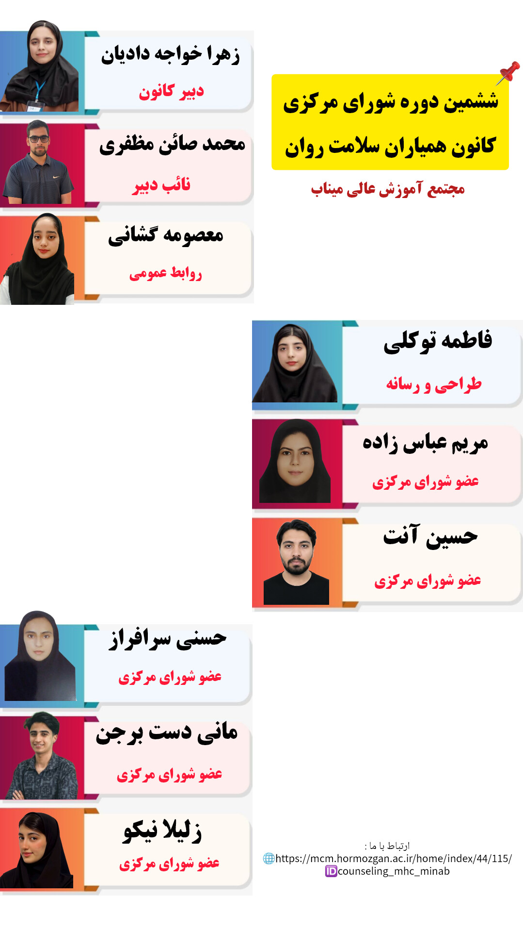 دانشجويان به عنوان اصحاب فكر و انديشه از سرمايههاي ناب هر جامعهای به شمار ميروند و نقش ارزنده و اهميت بي بديل آنها بر هيچكس پوشيده نيست. ششمین دوره شوراي مركزي كانون همياران اين مجتمع دانشگاهی که در هويتبخشي به فعاليتهاي داوطلبانه، آگاهی بخشی به فعالیت های مرکز مشاوره و سلامت ٬ به فعالیت میپردازند به حضور پر مهرتان معرفی میگردند. اميد است با وجود چنين دانشجويان مستعد و با انگيزه شاهد رشد و شكوفايى توانمنديهای هر چه بيشتر آنان و ايجاد یک محیط دانشگاهي با نشاط و پویا باشيم.