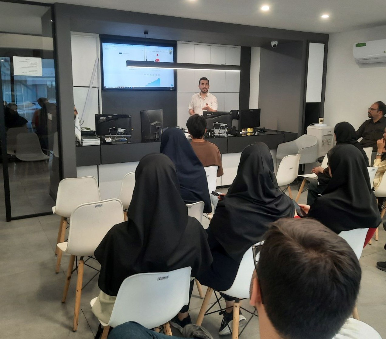 این بازدید که از ساعت ۱۴ تا ۱۶ برگزار شد، با ارائه تخصصی نماینده کارگزاری مفید- جناب آقای مهندس امین پورمیرزا همراه بود. در این بخش، دانشجویان با ساختار بازارهای مالی ایران، نحوه عملکرد بورس، انواع صندوق‌های سرمایه‌گذاری، اصول تحلیل بازار و همچنین نگاهی اجمالی به روندهای بین‌المللی آشنا شدند. فضای آموزشی ایجادشده، فرصتی کم‌نظیر برای درک واقعی‌تر سازوکارهای بازار سرمایه و ارتباط مباحث نظری با تجربه میدانی فراهم آورد.