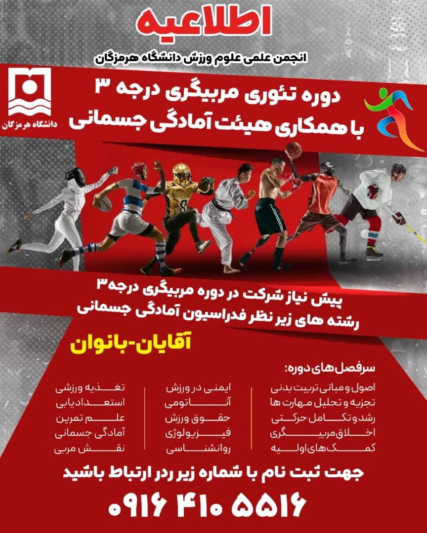 انجمن علمی علوم ورزش دانشگاه هرمزگان با هدف ارتقای سطح دانش تخصصی، توانمندسازی علمی و فراهم‌سازی بستر ورود دانشجویان و علاقه‌مندان به عرصه حرفه‌ای مربیگری، دوره تئوری مربیگری درجه ۳ را با همکاری هیئت آمادگی جسمانی برگزار می‌کند.