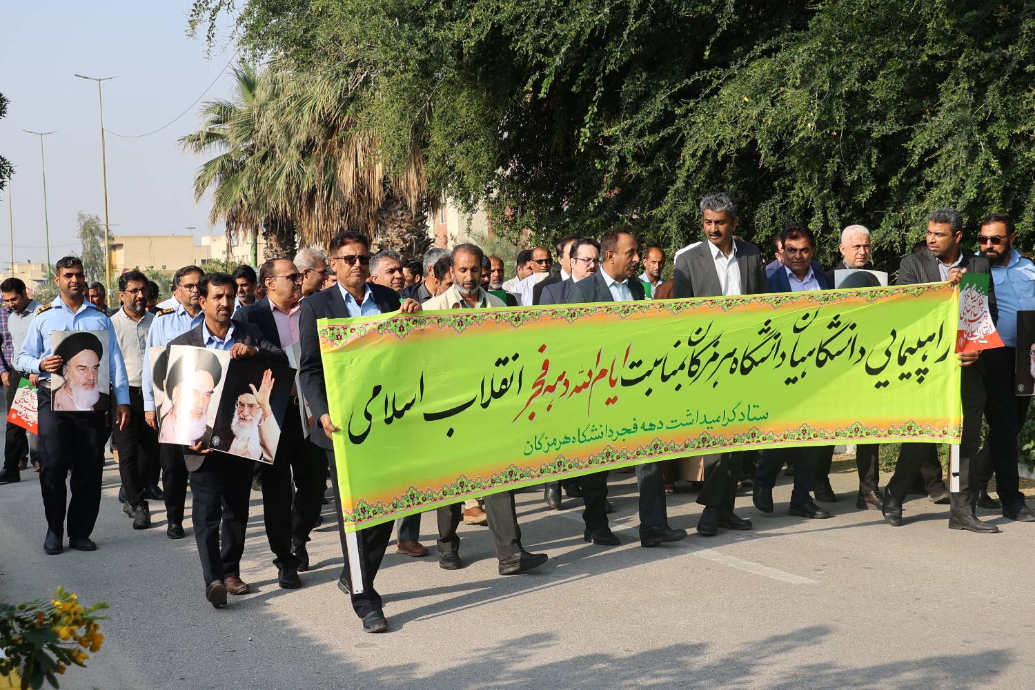 راهپیمایی به مناسبت فرارسیدن دهه مبارک فجر و سالروز پیروزی شکوهمند انقلاب اسلامی ایران، با حضور اعضای هیئترئیسه، اساتید وکارکنان دانشگاه برگزار شد. این مراسم با هدف گرامیداشت ایامالله دهه فجر، تجدید میثاق با آرمانهای والای انقلاب اسلامی و پاسداشت یاد و خاطره امام خمینی (ره) و شهداء برگزار گردید. شرکتکنندگان با حضور پرشور خود، ضمن سر دادن شعارهای انقلابی، بر پایبندی به ارزشهای انقلاب اسلامی و ادامه راه شهدا تأکید کردند.